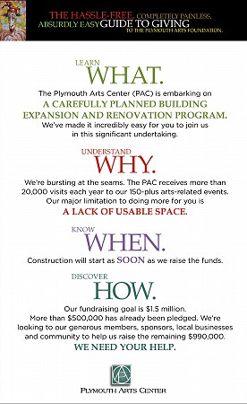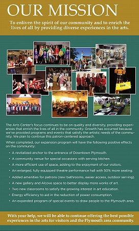 The idea for the Plymouth Arts Foundation, now known as the Plymouth Arts Center, actually began in a community over 2,000 miles away in Livingston, Montana. Livingston, a community of about 7,000 people has an active and very successful arts council, operating an arts program completely run by volunteers.