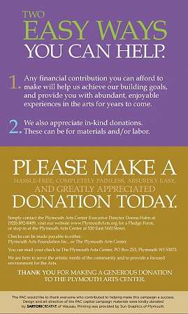 Nancy Smith, who was the Executive Director of the Plymouth Chamber at the time, decided that if the arts council could work in the Livingston, Montana it could work in Plymouth, Wisconsin. She determined that creating an arts group could benefit the community in many ways by improving the quality of life and increasing tourism. Smith sent out 200 postcards to area artists and community residents to assess their interest in forming an artist’s guild. Only seven cards were returned, however, she continued to pursue the idea. In January of 1993, Smith invited area artists, educators, and business people to a meeting at the Plymouth Library and together they decided to create the Plymouth Arts Foundation.