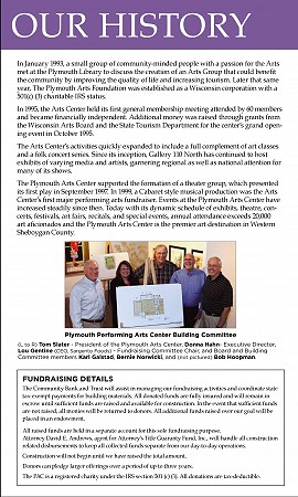 In January of 1995, representatives from the three proposed tenants of The Plymouth Center (Plymouth Art Foundation, Plymouth Historical Society, and the Plymouth Chamber of Commerce) met to discuss how to renovate the building to meet everyone’s needs. PAF held their first general membership meeting which was attended by 60 members. Board members wrote and received grants from the Wisconsin Arts Board and State Tourism Department for the grand opening celebration of The Plymouth Center. The Plymouth Center’s grand opening was held in October 1995 with an event called the Heritage and Arts Festival.